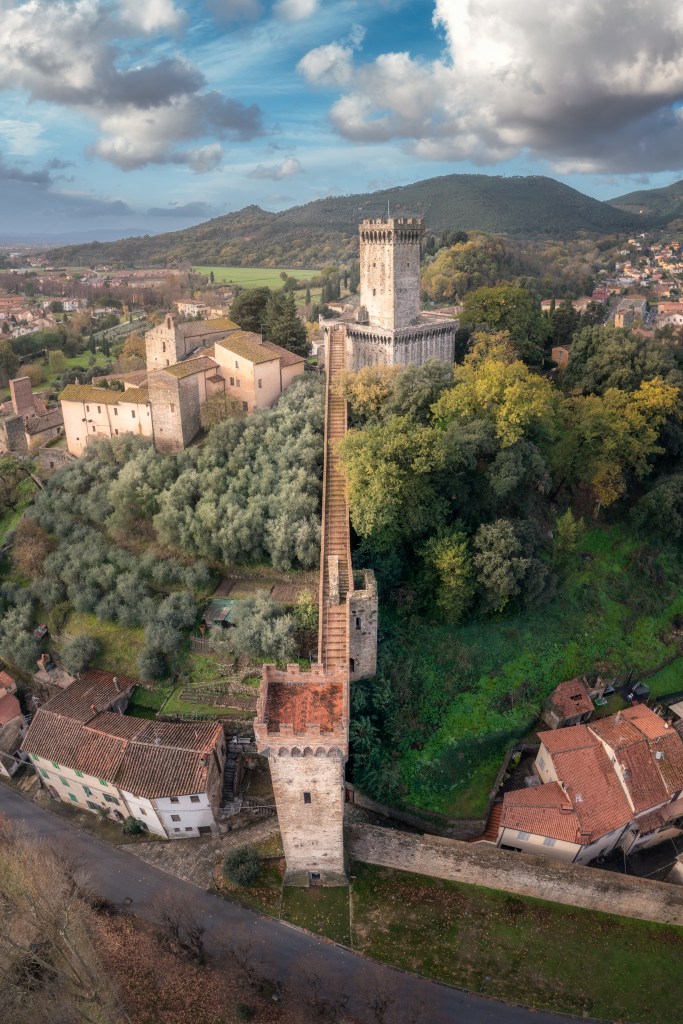 Vicopisano, a medieval village of probable Etruscan origin, rises at the foot of Monte Pisano, where the Seressa flows into the Arno. For centuries it was at the centre of communications and exchanges between Pisa, Lucca and Florence, thanks to the river routes and the watchtowers located on the surrounding promontories, and for this reason it was disputed and fortified several times. The last and perhaps most famous fortification witnessed the intervention of Filippo Brunelleschi at the top of the hill following the Florentine conquest in the 15th century, for the construction of the so-called “Rocca Nuova” and the wall walk to the Torre del Soccorso.